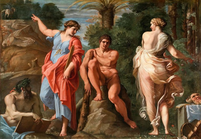Before Hercules restored order to the world by completing his twelve labors, he first had to choose between the steep, rugged road of Virtue and the soft, flowered road of Pleasure.
