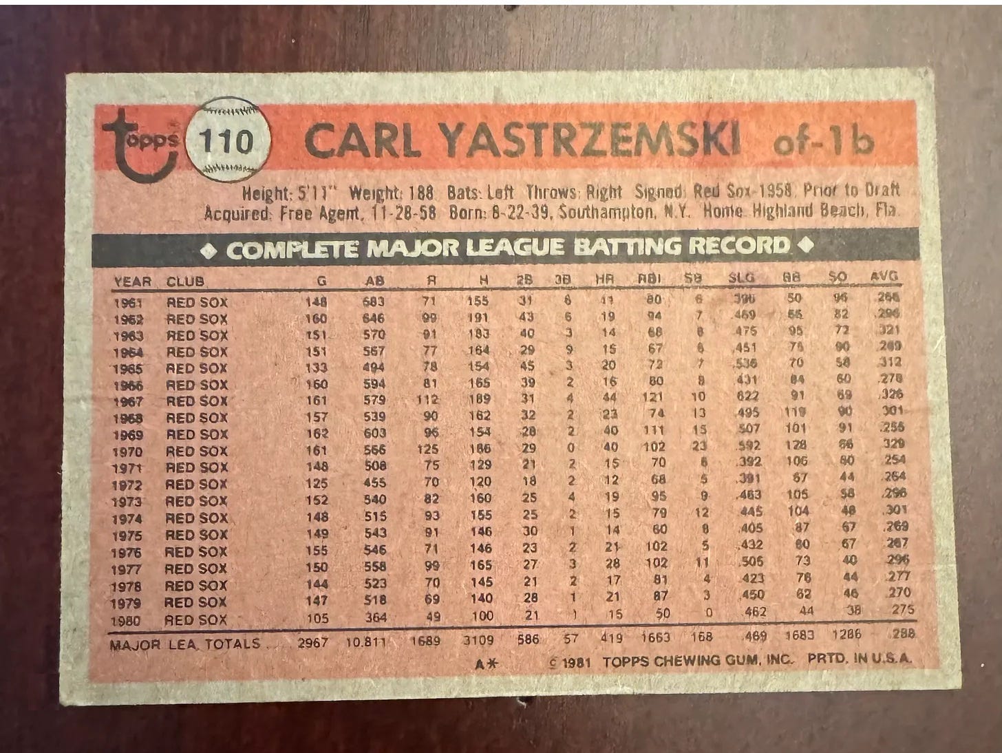 Later that summer, I noticed Yastrzemski’s card as I opened a new pack Mom had just bought us in the Kmart checkout aisle. I flipped it over and saw line after line of tiny print with his yearly stats: 1961 RED SOX, 1962 RED SOX, … 1980 RED SOX.